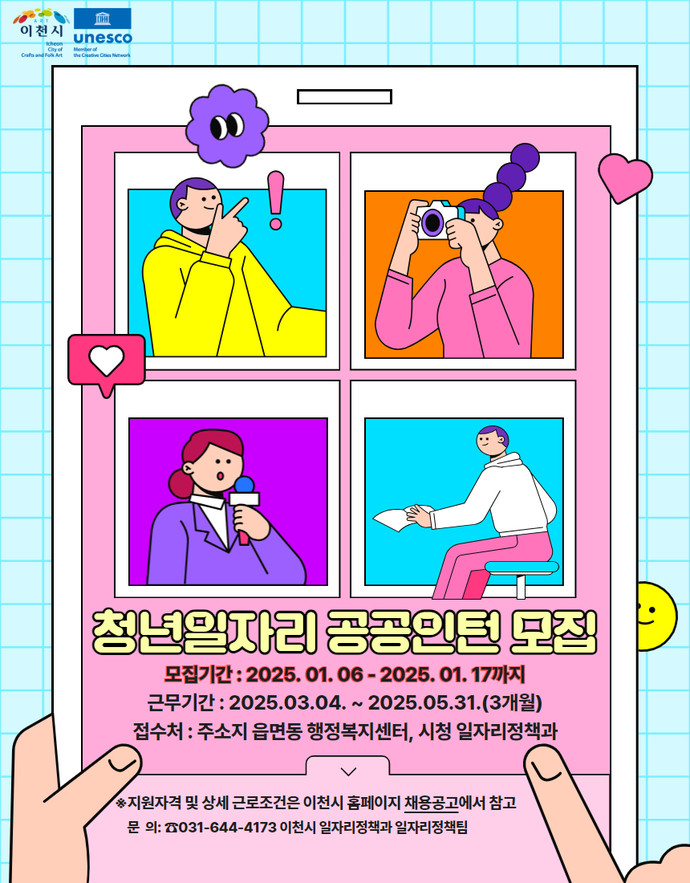선발된 참여자는 2025년 3월부터 5월까지 3개월간 이천시청과 읍면동 행정기관 등 공공부문에서 행정업무를 지원하게 된다.