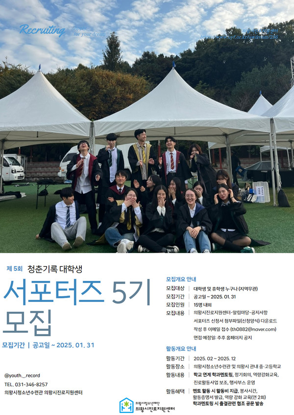 의왕시청소년재단 산하 의왕시진로지원센터 ‘꿈터’가 2025년도 대학생서포터즈 ‘청춘기록’ 5기를 31일까지 모집한다.