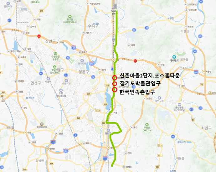 민속촌입구 정류장에서 4개 정류장을 더 지나 경기도박물관입구 정류장에 내리면 경기도박물관이 나온다. 경기도박물관은 경기도어린이박물관, 백남준아트센터 인근에 위치해 해당 지역 근방은 경기뮤지엄파크로 불리기도 한다.