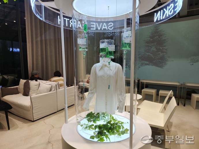 인테리어 면에서는 화이트톤으로 구성돼 흰 와이셔츠에 초록색 링거를 주입하는 오브제 등을 설치해 놨다. 카페 곳곳에는 초록 식물을 심고 한쪽 벽면에는 자연 풍경이 나오는 대형 스크린을 설치해 자연스러움과 모던함이 어우러져 미래적인 풍경을 느낄 수 있다.