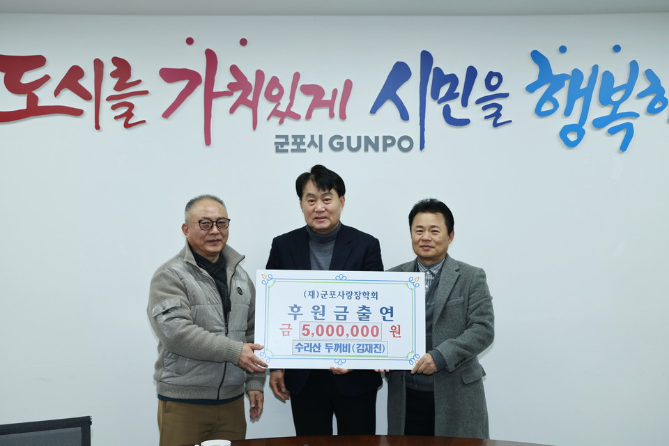 기탁식에는 하은호 군포시장, 김재진 수리산두꺼비 대표, 김성철 군포사랑장학회 이사장이 함께했다.