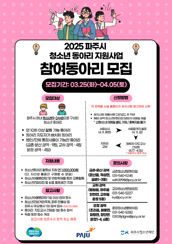 파주시는 (재)파주시청소년재단과 함께 '2025년 청소년동아리 지원 사업'에 참가할 동아리를 오는 4월 5일까지 모집한다.