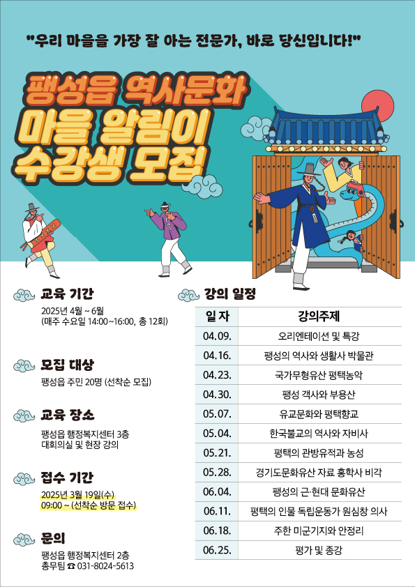 평택시 팽성읍 행정복지센터는 지역 주민을 대상으로 팽성읍의 역사와 문화를 알릴 ‘역사문화 마을 알림이’ 양성과정을 개설하고, 수강생을 선착순 모집한다.