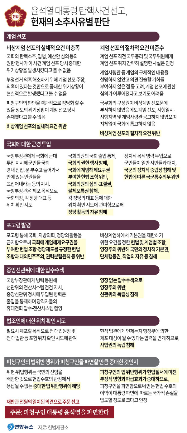 헌법재판소는 윤석열 대통령에 대한 탄핵심판에서 주요한 쟁점 5개 사안 모두 파면 요건에 해당한다고 봤다.