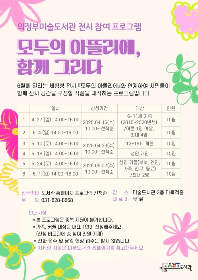 의정부미술도서관은 오는 6월 개최되는 체험형 전시 ‘모두의 아뜰리에’ 전(展)과 연계해 ‘모두의 아뜰리에, 함께 그리다’ 프로그램을 운영한다.