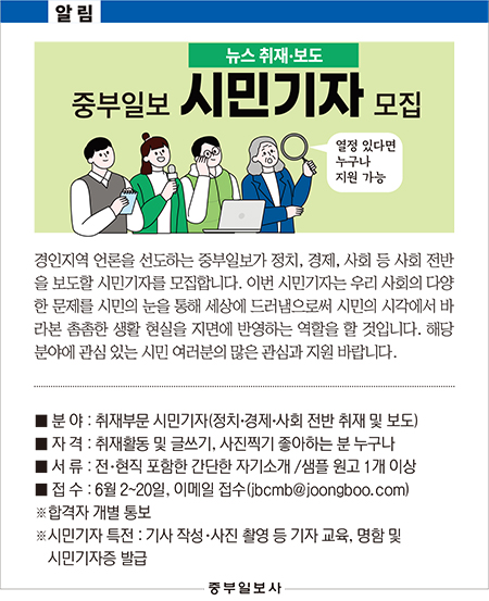 경인지역 언론을 선도하는 중부일보가 정치, 경제, 사회 등 사회 전반을 보도할 시민기자를 모집합니다. 이번 시민기자는 우리 사회의 다양한 문제를 시민의 눈을 통해 세상에 드러냄으로써 시민의 시각에서 바라본 촘촘한 생활 현실을 지면에 반영하는 역할을 할 것입니다. 해당 분야에 관심 있는 시민 여러분의 많은 관심과 지원 바랍니다.
