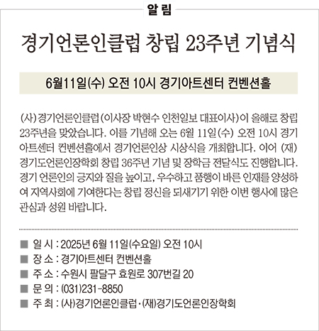 (사)경기언론인클럽(이사장 박현수 인천일보 대표이사)이 올해로 창립 23주년을 맞았습니다. 이를 기념해 오는 6월 11일(수) 오전 10시 경기아트센터 컨벤션홀에서 경기언론인상 시상식을 개최합니다. 이어 (재)경기도언론인장학회 창립 36주년 기념 및 장학금 전달식도 진행합니다. 경기 언론인의 긍지와 질을 높이고, 우수하고 품행이 바른 인재를 양성하여 지역사회에 기여한다는 창립 정신을 되새기기 위한 이번 행사에 많은 관심과 성원 바랍니다.
