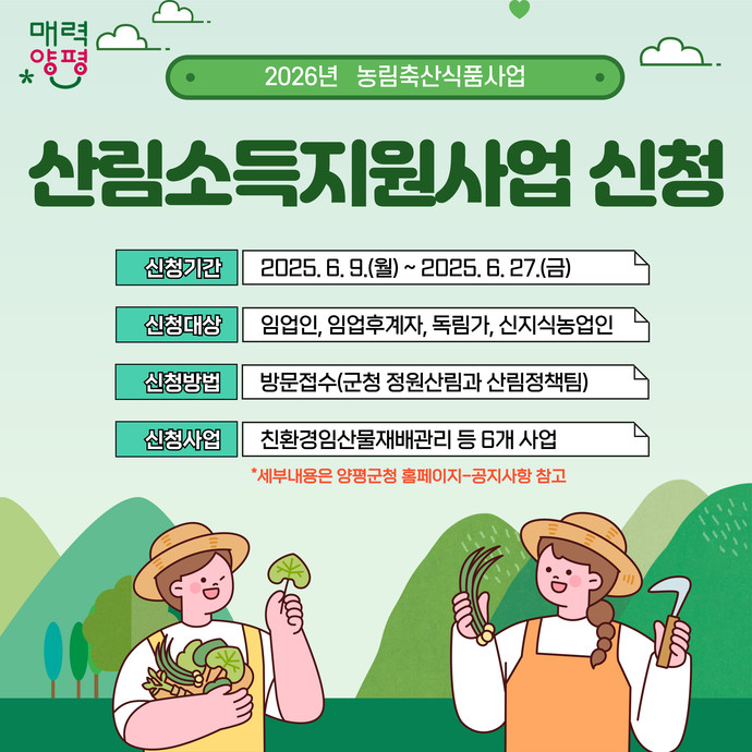 양평군은 관내 임업인과 생산자 단체를 대상으로 2026년 농림축산식품사업 산림소득분야 보조사업 신청을 오는 27일까지 접수한다.