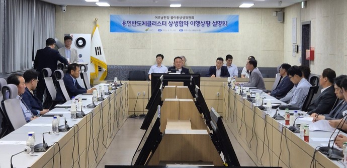 여주시는 지난 11일 시청 4층 상황실에서 ‘여주남한강 물이용 상생위원회’와 함께 용인반도체 클러스터 상생협약 이행 추진상황 설명회를 개최했다고 15일 밝혔다. 이날 설명회에는 이충우 여주시장과 시 관계직원,물이용 상생위원회 회원 등 30여 명이 참석했다.