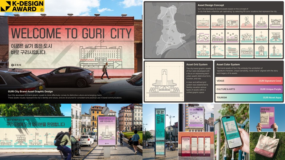 이번에 수상한 ‘구리시 도시브랜드 자산 그래픽 디자인 가이드'는 자연과 문화를 품은 구리시의 정체성과 매력을 전달하기 위해 ‘낯선 매력이 있는 도시’라는 관점에서 구리시의 18개 상징 요소를 시각화하였다. 이를 통해 도시의 가치를 이야기하는 그래픽 자산으로 활용할 수 있도록 개발되었다.