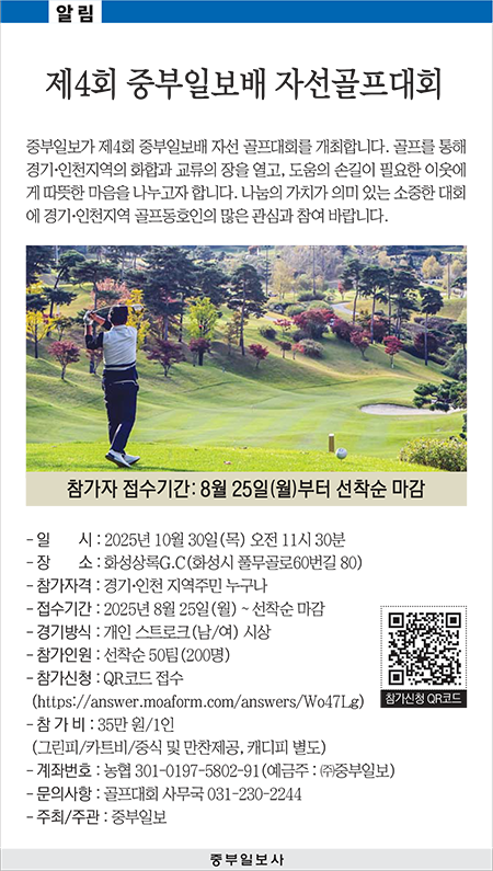 중부일보가 제4회 중부일보배 자선골프대회를 개최합니다. 골프를 통해 경기·인천지역의 화합과 교류의 장을 열고, 도움의 손길이 필요한 이웃에게 따뜻한 마음을 나누고자 합니다. 나눔의 가치가 의미 있는 소중한 대회에 경기·인천지역 골프동호인의 많은 관심과 참여 바랍니다.