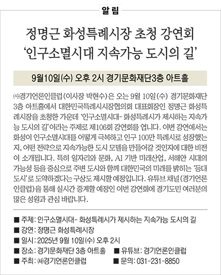 ㈔경기언론인클럽(이사장박현수)은 오는 9월 10일(수) 경기문화재단 3층 아트홀에서 대한민국특례시시장협의회 대표회장인 정명근 화성특례시장을 초청한 가운데 '인구소멸시대-화성특례시가 제시하는 지속가능 도시의 길'이라는 주제로 제106회 강연회를 엽니다. 이번 강연에서는 화성이 인구소멸시대를 어떻게 극복하고 인구 100만 특례시로 성장했는지, 어떤 전략으로 지속 가능한 도시 모델을 만들어갈 것인지에 대한 비전이 소개됩니다. 특히 일자리와 문화, AI 기반 미래산업, 서해안 시대의 가능성 등을 중심으로 주변 도시와 함께 대한민국의 미래를 밝히는 등대 도시로 도약하겠다는 구상도 제시할 예정입니다. 유튜브채널(경기언론인클럽)을 통해 실시간 중계할 예정인 이번 강연회에 경기도민 여러분의 많은 성원과 관심 바랍니다.