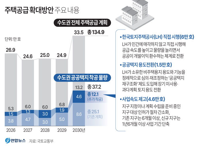 정부는 이번 공급대책을 통해 2030년까지 수도권에서 연평균 27만 가구, 5년간 총 135만 가구 규모의 신규 주택 착공이 가능할 것으로 보고 있다.