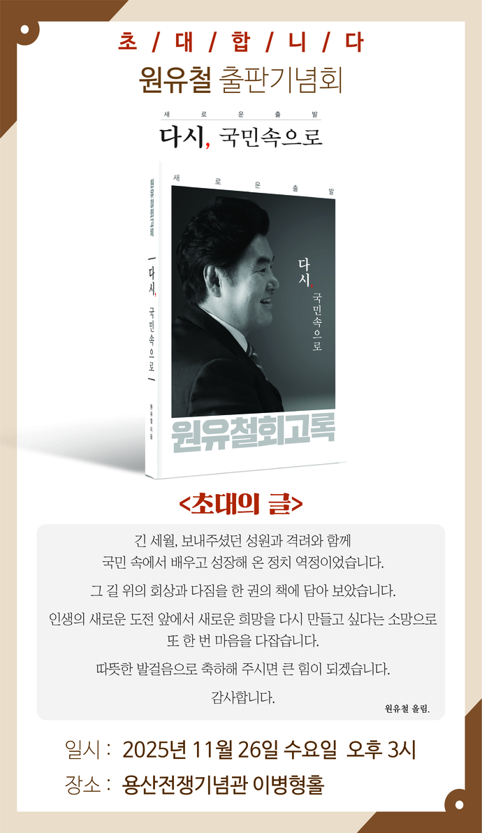원유철 전 미래한국당 대표가 35년 정치 인생이 담긴 회고록 ‘다시, 국민속으로’ 출판기념회를 오는 26일 용산 전쟁기념관에서 개최한다.